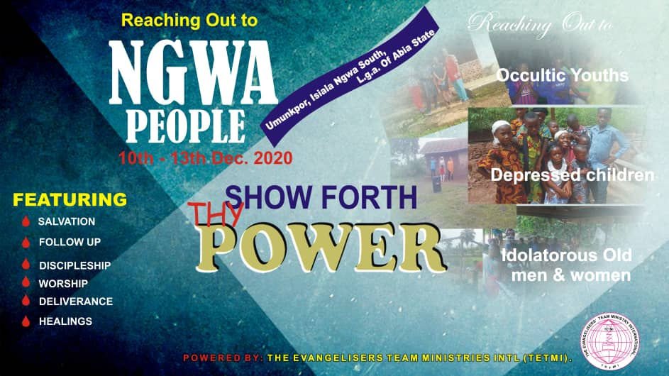 TETMI- The Evangelisers Team Ministries Intl’ Inc., exists to reach the unreached, least- reached, least resourced and Rural Communities with the Gospel message in a holistic Man.